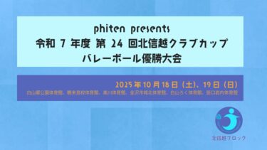 令和 7 年度 第 24 回北信越クラブカップバレーボール優勝大会 大会概要 日程 2025年10月18日(土)、19日(日) 会場 白山郷公園体育館 鶴来高校体育館 美川体育館 金沢市城北体育館 白山ろく体育館 辰口岩内体育館 開催要項 開催要項(PDF) 大会結果 結果   […]
